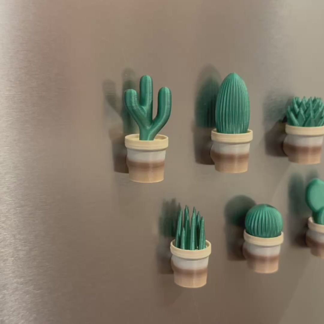 Key Features - Adorable miniature plant pot designs - Variety of succulent and cactus styles - Strong 10mm × 3mm magnets included - Perfect for fridge, office boards, lockers - Two-color design (pot + plant) - Compact size: 0.8” L × 0.8” W × 1.6” H - Functional and decorative - Custom color combinations available - Premium PLA material - Locally produced in Nashville, Tennessee